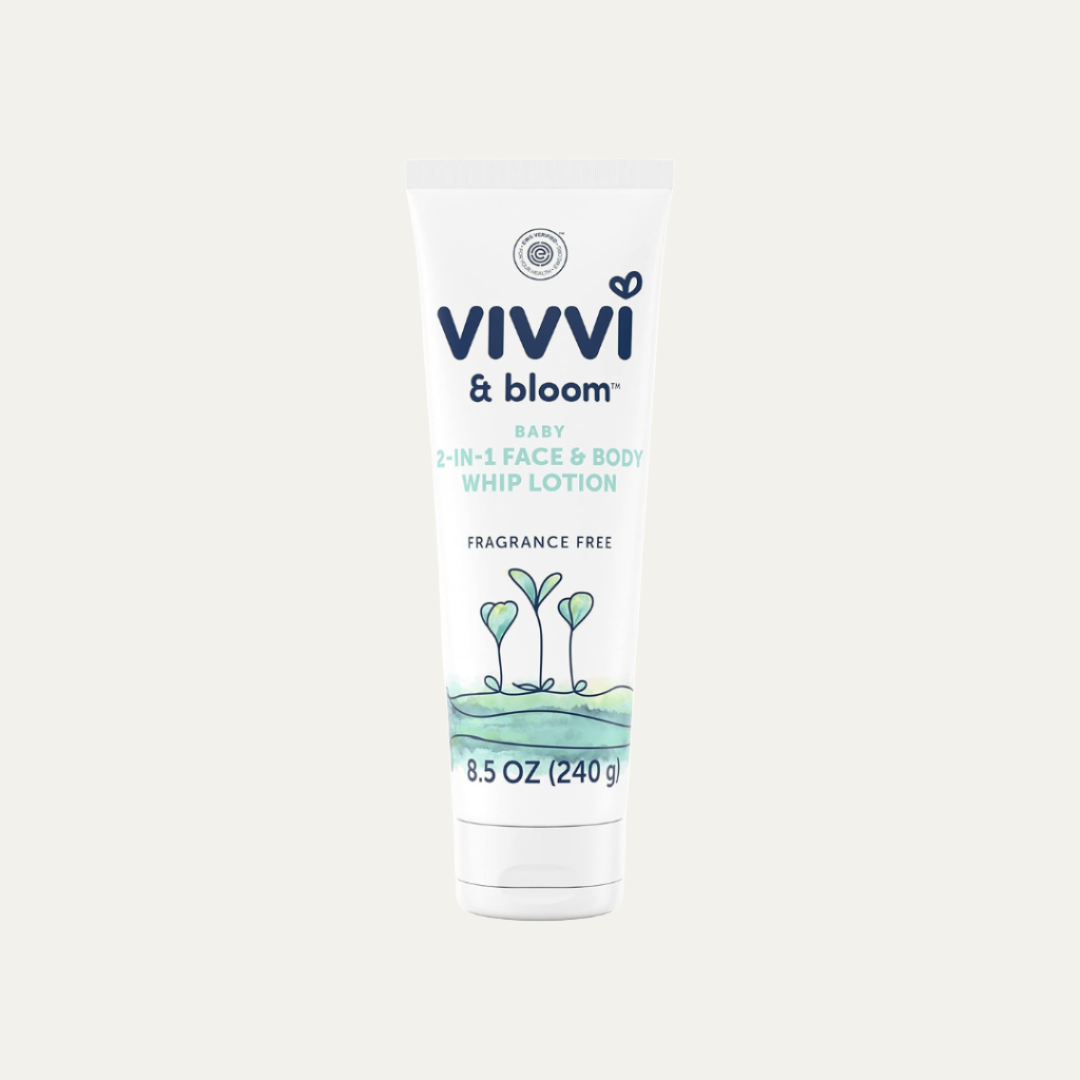Gently moisturize baby's delicate skin for 48 hours with Vivvi & Bloom 2-in-1 Fragrance-Free Baby Face & Body Whip Lotion. EWG Verified. Clinically tested on sensitive skin this face & body lotion provides long-lasting hydration for baby's developing skin. With its 96% natural origin formula,* including responsibly sourced shea butter, this lotion is non-sticky and melts into skin for easy application & contains a natural origin** prebiotic to help support skin's natural lipid production & make it more resilient. The fragrance-free lotion formula hydrates skin & 92% of parents agree that baby's skin felt healthier after the first use. This pediatrician- & dermatologist-tested lotion is hypoallergenic, pH-balanced, vegan & not tested on animals. It is formulated without fragrances, parabens, phthalates, phenoxyethanol, dyes, gluten, silicones & essential oils. *As per ISO 16128-1:2016 based on cumulative volume including water. **Naturally derived ingredients as per ISO 16128-1:2016.