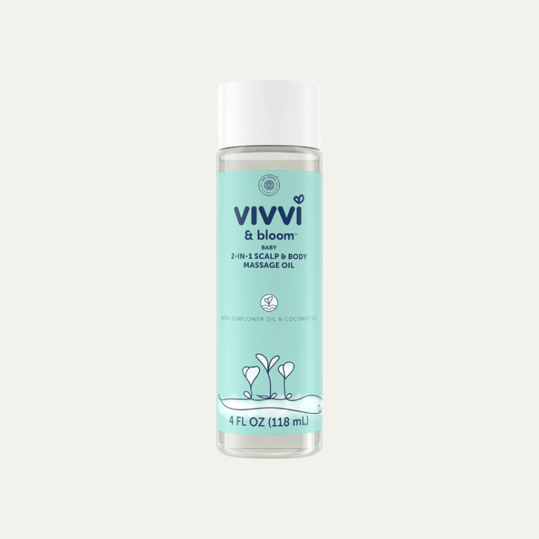 Help moisturize baby's dry, delicate skin & scalp with Vivvi & Bloom 2-in-1 Baby Scalp & Body Massage Oil. Clinically tested on sensitive skin, this baby body oil with a naturally derived scent** helps to remove dry flakes on the scalp. With its 99.8% natural origin formula,* including coconut & sunflower oils, the oil has a gentle, non-toxic formula that absorbs quickly to leave skin & scalp feeling soft & moisturized. The body oil helps improve the look & feel of skin & 98% of parents agree that it leaves baby's skin feeling soft & smooth. Pediatrician- & dermatologist-tested baby oil is hypoallergenic, vegan & not tested on animals & formulated without parabens, phthalates, phenoxyethanol, dyes, gluten, silicones & essential oils. To help remove scalp flakes, massage the oil into scalp to soften, wait a few minutes, gently comb baby's hair & then wash with shampoo. *As per ISO 16128-1:2016 based on cumulative volume including water. **Naturally derived ingredients as per ISO 16128-1:2016.