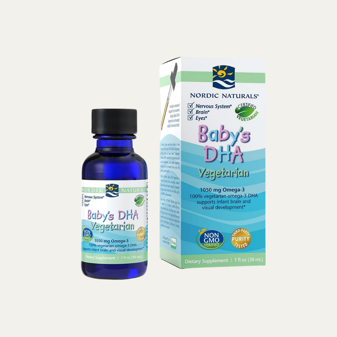 Vegetarian DHANordic Naturals Baby’s DHA Vegetarian is made exclusively from microalgae, nature’s original source of marine omega-3, for essential omega nutrition without the use of fish, and is non-GMO and hexane free. | Exceptionally Pure Algae OilEvery batch of Nordic Naturals algae oils is tested by a third-party certified lab for environmental toxins, including heavy metals. All algae oils are in the triglyceride form and surpass the strictest international standards for purity and freshness. | Brain & Visual DevelopmentA baby’s brain more than doubles in size during the first years of life. DHA is the primary building block of brain tissue.* Adequate intake of DHA is essential for proper brain and visual development, and remains necessary throughout life to maintain brain, eye, and nervous system health.* |