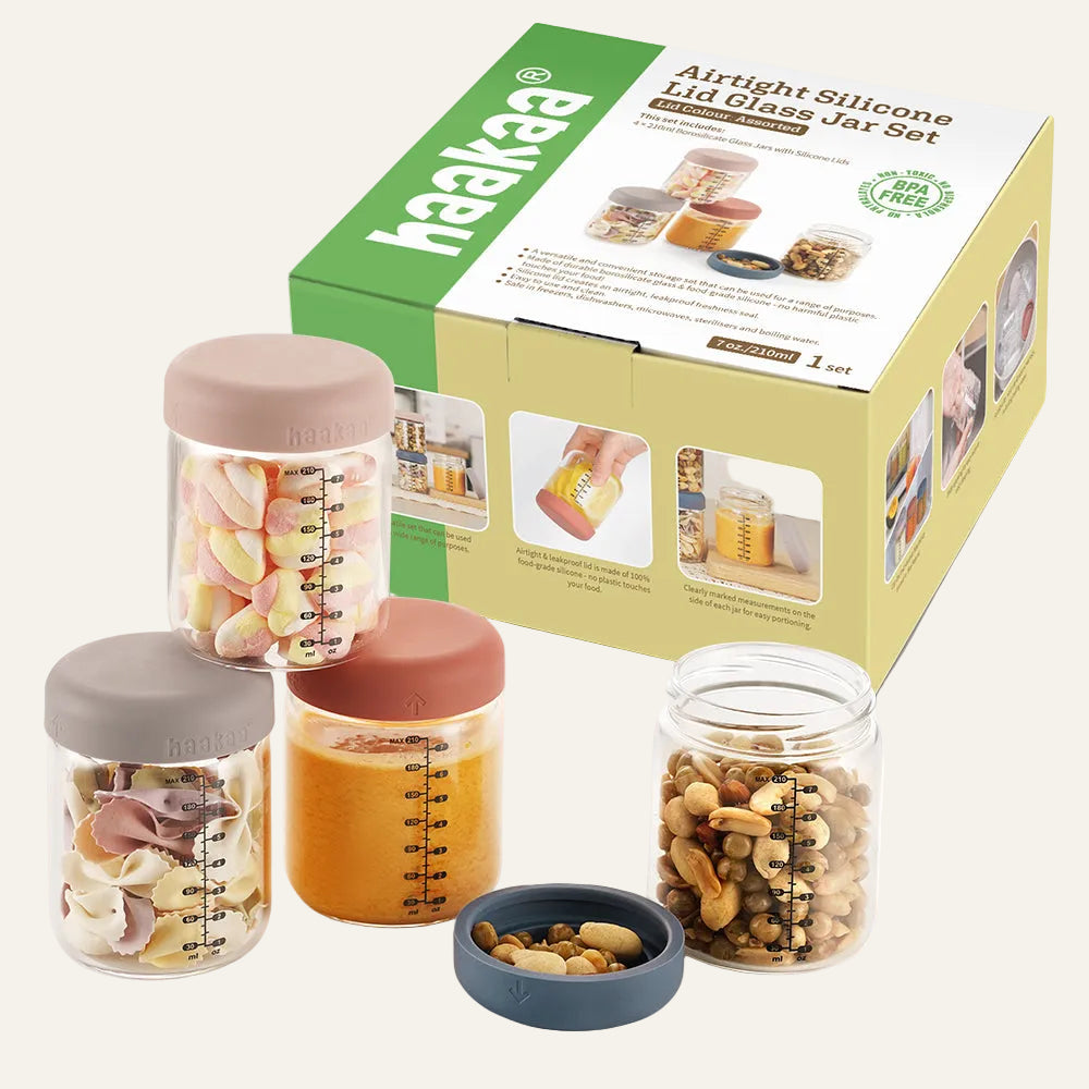 Organize your home with Haakaa’s Sealed Glass Storage Jars! This set comes with four durable 7 oz/200 ml borosilicate glass jars, each with its own airtight and leakproof 100% silicone lid.