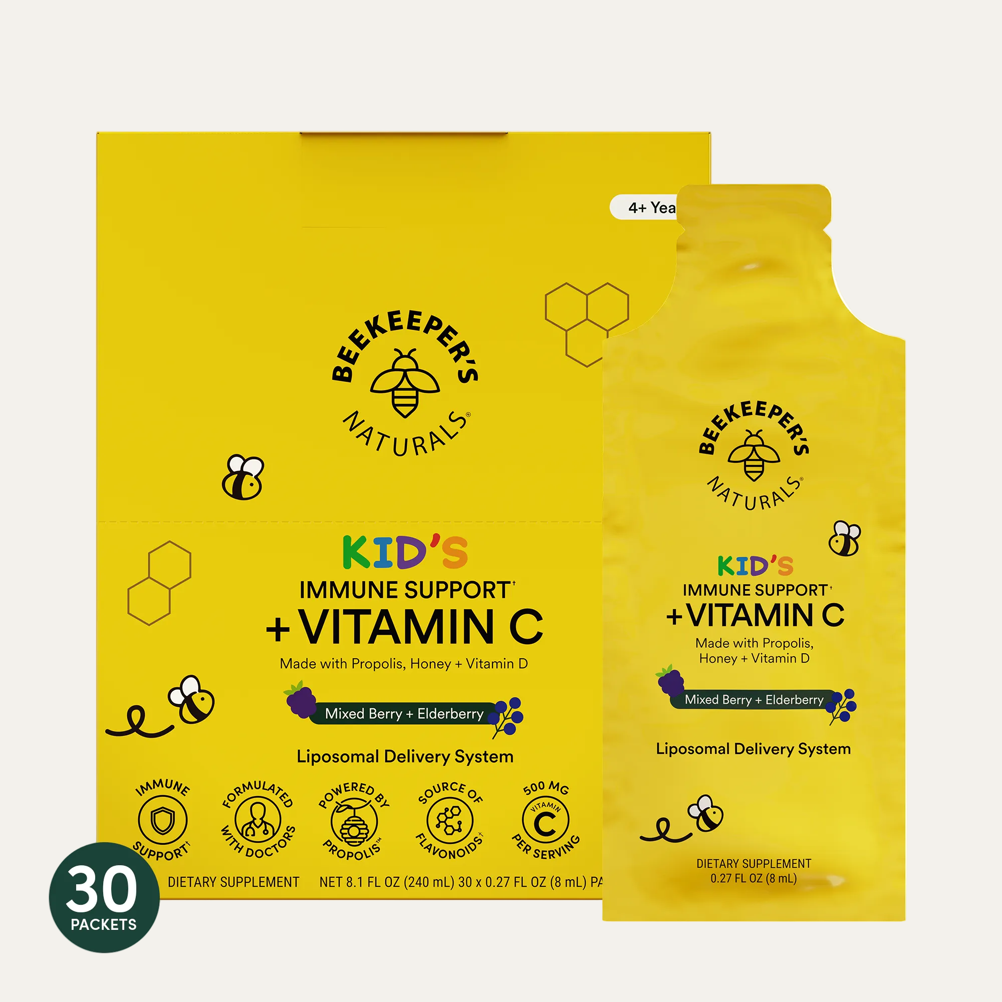 Our supercharged immune support is now gentle enough for kids. Each convenient and delicious packet delivers a powerful blend of Propolis, 500mg of Vitamin C, Vitamin D, and Elderberry to support kids' immune systems for every adventure. The liposomal formula optimizes absorption, so every drop works as hard as they play.