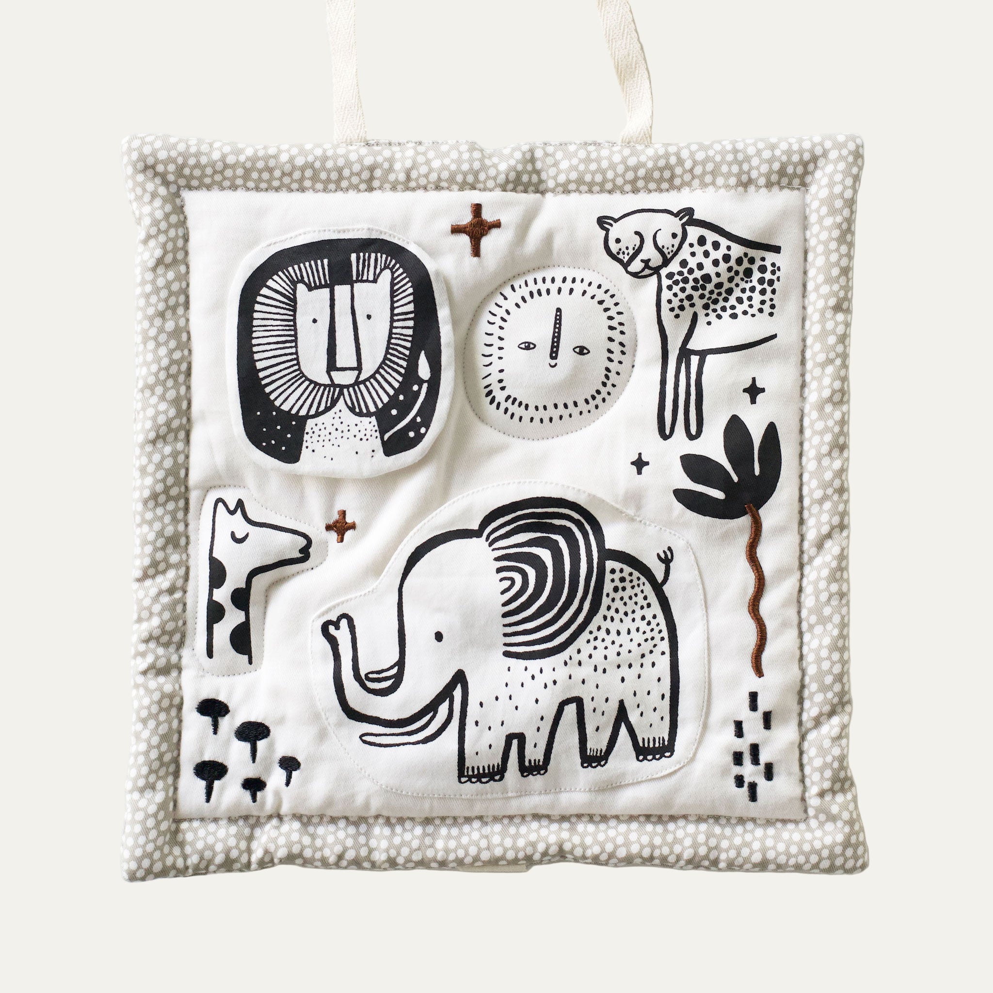 The Safari Activity Pad keeps your baby stimulated with a variety of sensory stimulation from high contrast graphics, and hidden items including crinkly features, a rattle, a squeak and a maple wood teething ring hidden behind the Elephant.